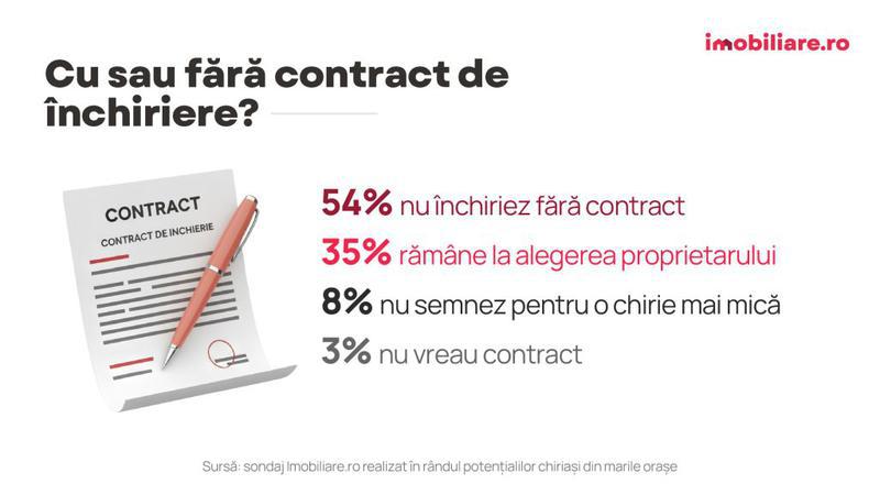 Tot mai mulți români înțeleg importanța semnării unui contract de închiriere cu proprietarul. Circa 54% dintre cei care au luat parte la sondajul Imobiliare.ro au declarat că nu intenționează să închirieze o locuință fără să semneze un astfel de document care îi poate proteja pe termen lung de potențiale abuzuri venite din partea proprietarului, precum majorarea chiriei peste noapte, evacuarea din locuință fără o notificare prealabilă realizată cu o durată de timp rezonabilă în avans sau refuzul înapoierii garanției.