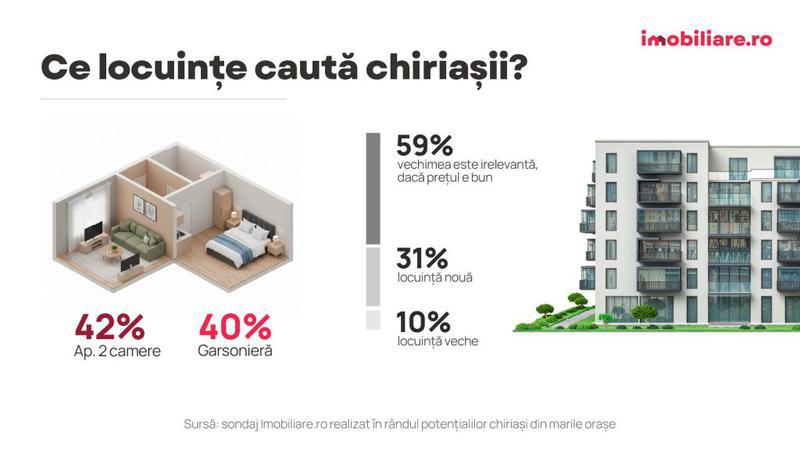 Chiriașii aflați, în momentul de față, în căutarea unei locuințe sunt interesați, în principal, de apartamentele cu 2 camere. Acestea au cea mai mare proporție în totalul ofertei și pot fi considerate cele mai versatile, atrăgând atât studenții veniți în marile orașe înainte de începerea noului an universitar, cât și tinerii și familiile aflate la început de drum. Garsonierele sunt aproape la fel de căutate în marile orașe, aproximativ 40% dintre cei care au participat la sondajul Imobiliare.ro arătându-și interesul față de acestea.