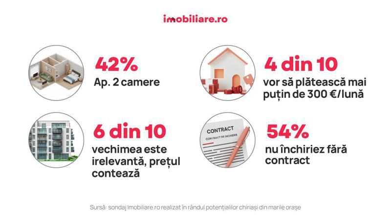 Chiriașii își doresc să se mute, în această toamnă, în garsoniere sau apartamente cu 2 camere și visează să le achite lunar proprietarilor sub 300 de euro. Vechimea imobilelor este mai puțin relevantă, cât timp prețul este bun, dar dacă ar putea să aleagă chiriașii ar prefera o locuință nouă. Tot mai puțini sunt cei care acceptă un compromis pentru a-și reduce cheltuielile, când vine vorba de semnarea unui contract de închiriere, arată rezultatele unui sondaj realizat de Imobiliare.ro.