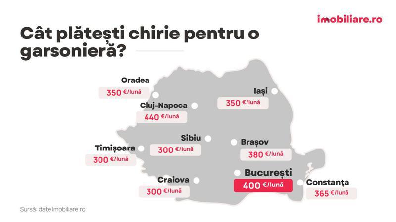Deși își doresc să achite lunar mai puțin de 300 euro pe chirie, nu sunt mulți cei care și reușesc să facă acest lucru. În Timișoara, Craiova și Sibiu chiria medie pentru o garsonieră este de 300 de euro, dar prețurile cresc considerabil în alte centre urbane majore din țară care sunt și importanți poli universitari.