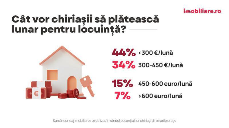 Conform sondajului realizat de Imobiliare.ro, 44% dintre chiriași și-ar dori să plătească lunar mai puțin de 300 de euro proprietarului, în timp ce 34% consideră că un buget cuprins între 300-450 euro este unul acceptabil pentru închirierea unei locuințe într-un oraș mare din țară. Aproximativ 15% dintre respondenți sunt dispuși să achite sume cuprinse între 450-600 euro pentru a se muta cu chirie și doar 7% ar achita lunar peste 600 euro pentru a închiria o locuință.