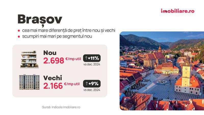 Prețul mediu solicitat pentru apartamentele noi din Brașov a ajuns până la începutul lunii ianuarie la 2.698 euro/mp util, după un avans cu 2% în decembrie, al doilea cel mai mare din țară, după cel înregistrat în Capitală.