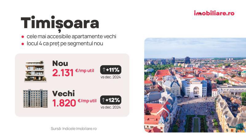 Prețurile solicitate pentru apartamentele noi din Timișoara s-au menținut în ultima lună a anului trecut la un nivel stabil. În medie, cumpărătorii trebuie să achite 2.131 euro/mp util pentru a face o astfel de achiziție, fapt ce plasează orașul de pe Bega pe locul al patrulea în topul celor mai scumpe din țară.