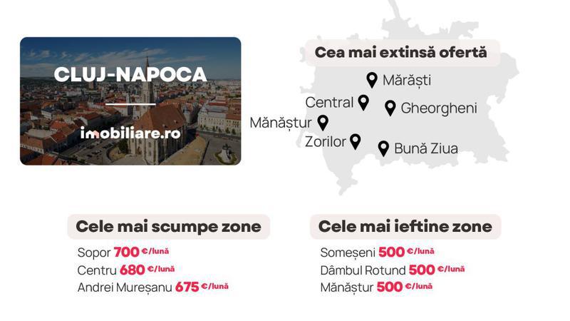 Diferențele dintre cele mai scumpe și cele mai ieftine cartiere sunt, de asemenea, mult mai limitate în Cluj-Napoca. Cele mai scumpe zone din oraș sunt Sopor, zona centrală și Andrei Mureșanu. Achiți, în medie, 650 euro/lună în cartiere precum Bună Ziua și Europa, respectiv 600 euro/lună în Borhanci, Gheorgheni, Între Lacuri, Iris, Plopilor sau Zorilor.