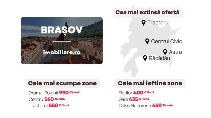 Cele mai multe apartamente de închiriat pot fi găsite în Brașov în cartierele Tractorul și Astra. Zone precum Centrul Civic, Răcădău și Avantgarden ofertă, de asemenea, un număr mai mare de opțiuni celor care vor să se mute cu chirie la sfârșitul acestei veri.