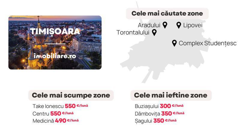 Cele mai multe locuințe de închiriat pot fi găsite în Timișoara în zona Calea Aradului (480 euro/lună) și în zona Complexului Studențesc (350 euro/lună). O ofertă extinsă poate fi întâlnită și în cartierele Torontalului și Lipovei. Acestea sunt și unele dintre cele mai căutate zone din oraș în rândul celor care își doresc să închirieze o locuință.