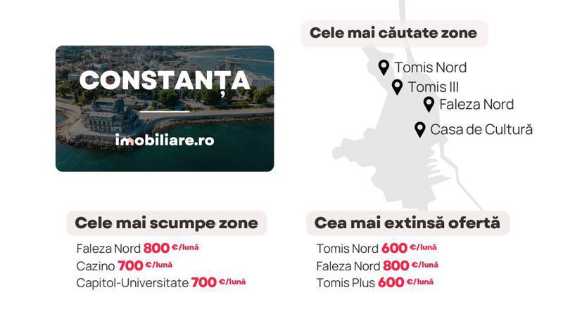 Cele mai multe apartamente de închiriat pot fi găsite în cartierul Tomis Nord. Acesta este și unul dintre cele mai căutate din oraș, dar nici pe departe unul dintre cele mai ieftine. Chiria medie solicitată de către proprietari pentru un apartament ajunge la 600 euro/lună. Cei care își doresc să aibă cât mai multe opțiuni la dispoziție atunci când își aleg viitoarea locuință își pot orienta căutările și spre cartiere precum Tomis Plus (600 euro/lună) sau spre zona centrală (690 euro/lună) a orașului.