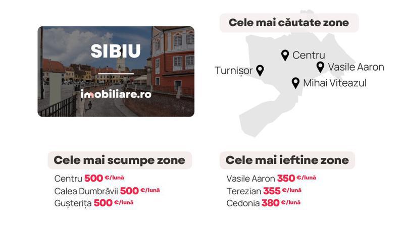 Chiria medie solicitată în Sibiu pentru o garsonieră se menține în jurul valorii de 300 euro/lună, similară cu cea înregistrată în aceeași perioadă a anului trecut. În cazul apartamentelor cu 2 și 3 camere, suma medie pe care trebuie să o achite un chiriaș la finalul lunii s-a majorat ușor în același timp la 400 euro, respectiv la 520 euro. În cazul apartamentelor cu 4 camere, chiriile au scăzut de la 700 la 630 euro/lună față de vara trecută, arată datele Imobiliare.ro. Numărul lor este, însă, extrem de limitat la nivelul pieței.