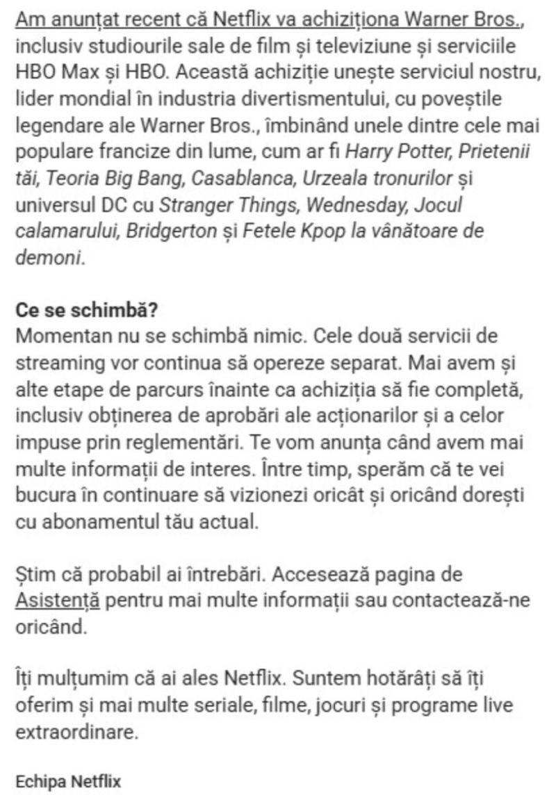 Netflix a confirmat oficial achiziția Warner Bros. printr-un mesaj trimis abonaților. Platforma anunță fuziunea cu HBO, HBO Max și studiourile Warner, dar precizează că — cel puțin pentru moment — nu se schimbă nimic pentru utilizatori.