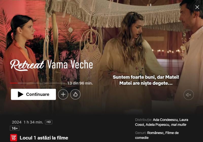 Film românesc foarte așteptat, „Retreat Vama Veche”, lansat recent pe Netflix, a devenit în timp record cel mai urmărit film de pe platforma de streaming. Povestea captivantă, cu Adela Popescu, Laura Cosoi și Ada Condeescu în rolurile principale, a avut premiera pe marile ecrane în octombrie.